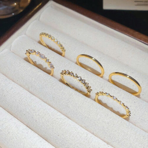 Bộ 6 nhẫn trơn tròn hình học mix đính đá zircon XI VÀNG PHA cao cấp, Bộ nhẫn nữ Đơn giản sang trọng B3604