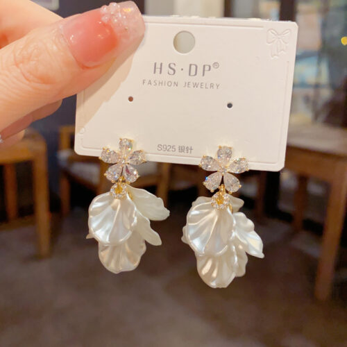 Bông tai cánh trắng mix hoa 5 cánh đá zircon cao cấp xi vàng pha, thiết kế độc đáo B3090