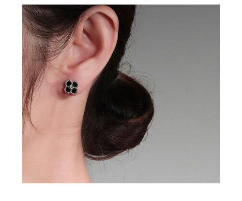 Bông tai cỏ 4 lá nhí đá ĐEN viền xi bạc 925 cao cấp, bông tai nhí sát tai thiết kế lấp lánh sang trọng B4572