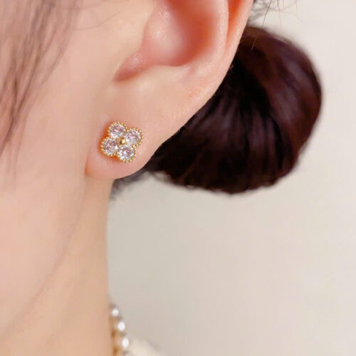 Bông tai cỏ 4 lá nhí đá TRẮNG viền xi vàng pha cao cấp, bông tai nhí sát tai thiết kế lấp lánh sang trọng B4573