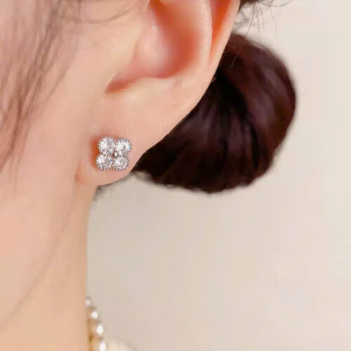Bông tai cỏ 4 lá nhí đá zircon trắng viền xi bạc 925 cao cấp, hoa tai nhí sát tai sang trọng độc đáo B4568