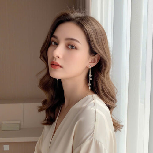 Bông tai dáng dài đi tiệc hoa đá zircon 5 cánh mix ngọc nhỏ xinh AB04267