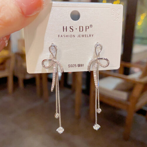 Bông tai NƠ ĐÁ ZIRCON tua rua giọt nước xi bạc 925 cao cấp, hoa tai thiết Kế Hàn Quốc sang trọng B4403