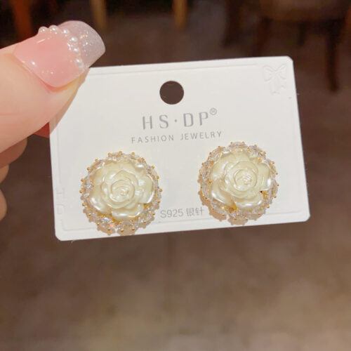 Bông tai sát tai HOA HỒNG TRẮNG viền đá zircon xi bạc 925 cao cấp B3085