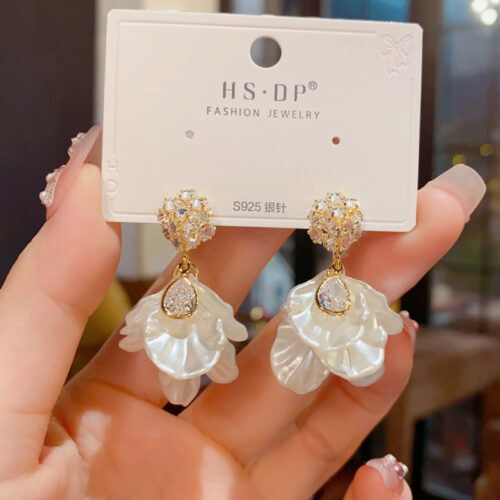 Bông tai tua rua cánh HOA TRẮNG quả cầu đính đá zircon cao cấp, bông tai thiết kế Hàn quốc B3098