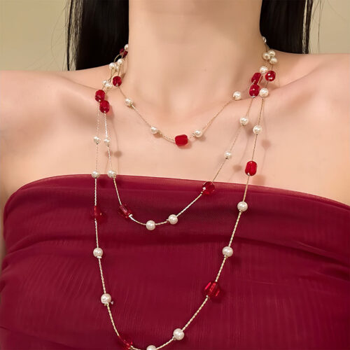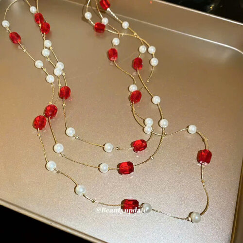 Dây chuyền dáng dài tầng ĐỎ TRẮNG độc đáo, phụ kiện dây chuyền đi tiệc sang trọng B4090