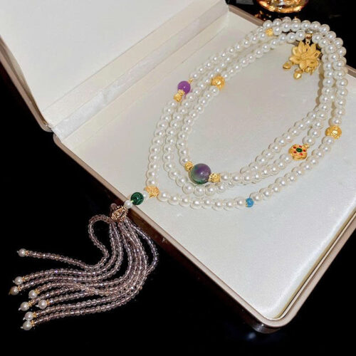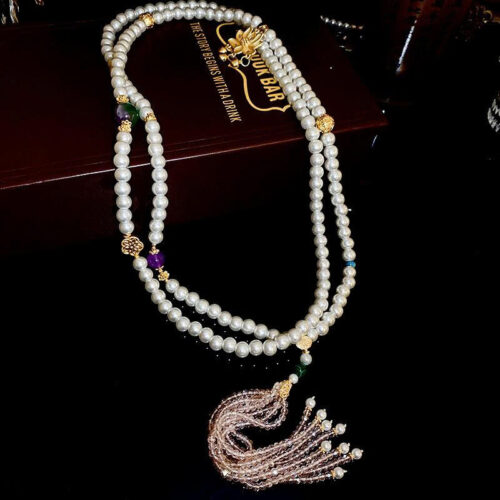Dây chuyền ngọc trai DÀI HOA SEN xi vàng pha cao cấp mix pha lê, dây chuyền ngọc trai đồ lam, dây chuyền dáng dài áo dài B4748 số lượng