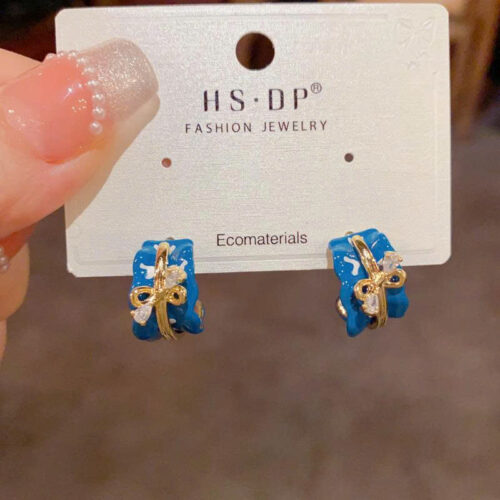 Hoa tai chữ C nơ xếp ly xanh dương độc đáo cao cấp, Hoa tai thiết kế Hàn quốc độc đáo, sang trọng B4532