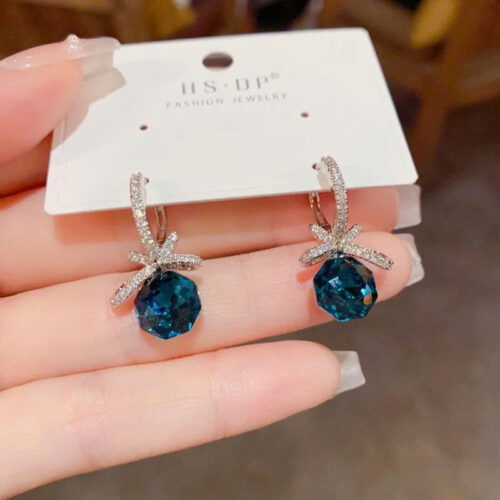 Hoa tai nữ dạng móc NƠ ĐÁ XANH DƯƠNG xi bạc 925 cao cấp, hoa tai thiết Kế Hàn Quốc sang trọng đi tiệc B4405