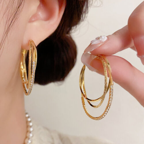 Hoa tai Tròn 3 vòng ĐK 3cm Đá zircon lấp lánh vàng pha 925 cao cấp, Hoa tai tròn basic cơ bản thiết kế sang trọng B4416