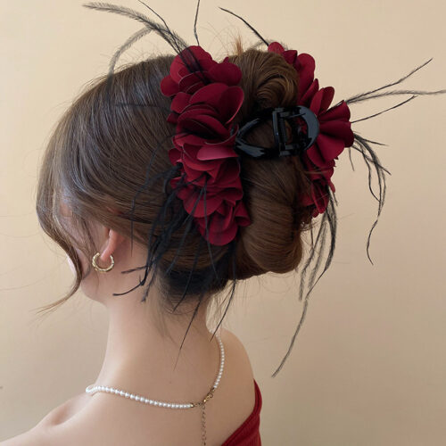 Kẹp gắp tóc lớn lông vũ HOA ĐỎ thiết kế độc đáo, phụ kiện kẹp tóc nữ cao cấp, quà tặng bạn gái B3521