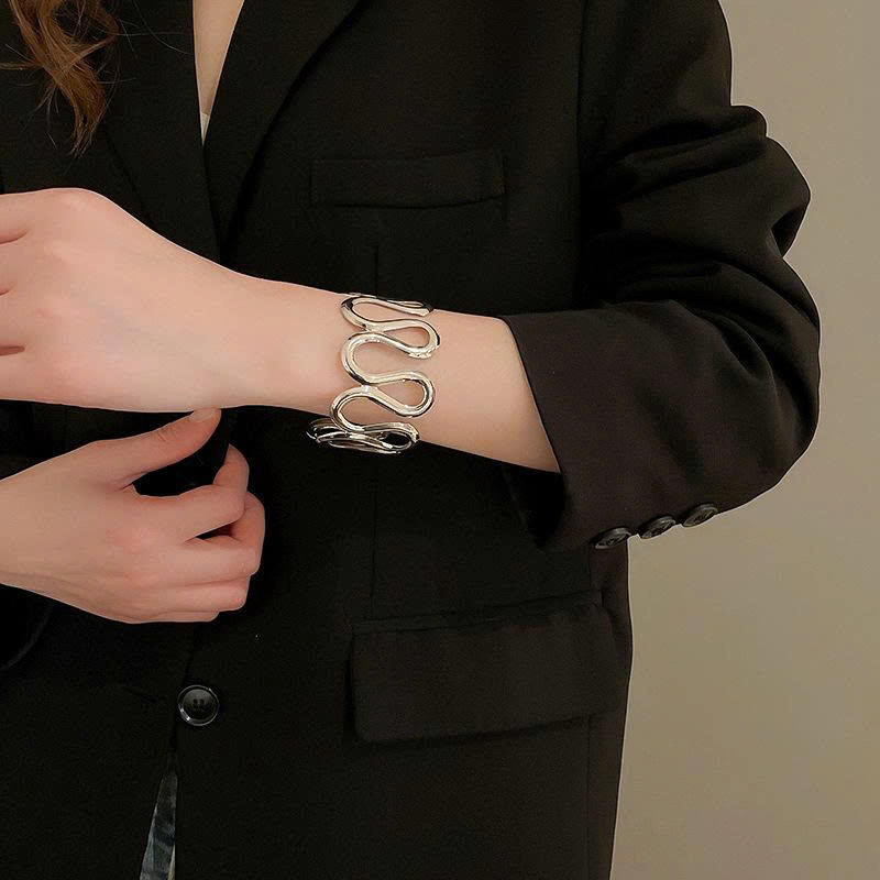 Vòng tay HỞ màu BẠC sóng lên xuống, vòng tay cá tính bản to, phụ kiện vòng tay thời trang độc đáo phong cách B4821
