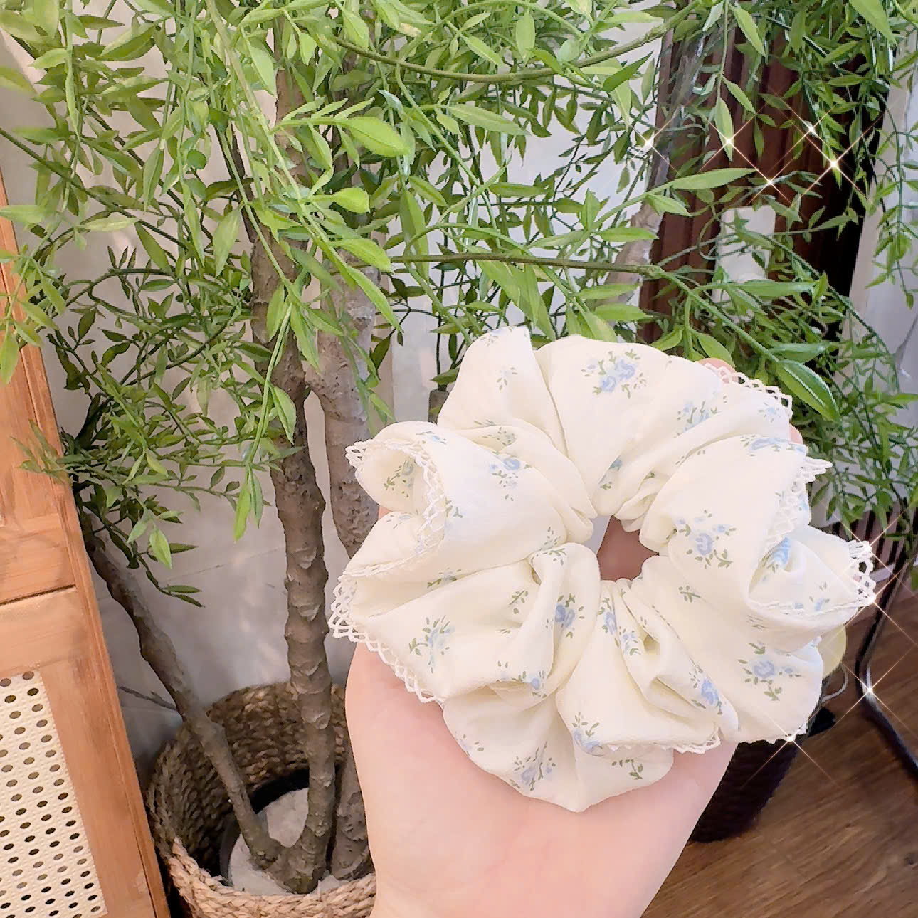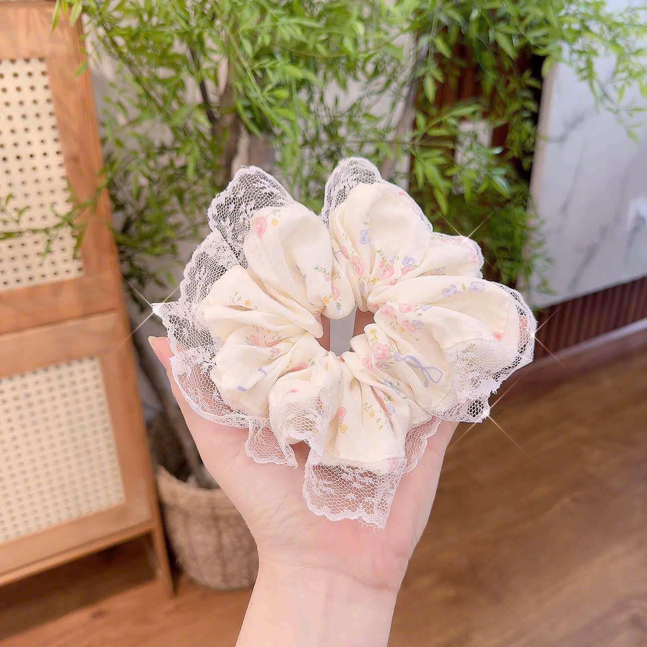 • Cột tóc họa tiết viền VOAN ren tone Hoa nền KEM dễ thương, phụ kiện cột tóc nữ đẹp B3052
